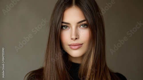 Beautiful young woman with long brown hair and captivating green eyes posing confidently against a soft neutral background in natural light
