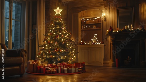 Beautifully decorated Christmas tree indoors, adorned with twinkling string lights, ornaments, and a star on top. The room is warm and cozy, with gifts wrapped under the tree.