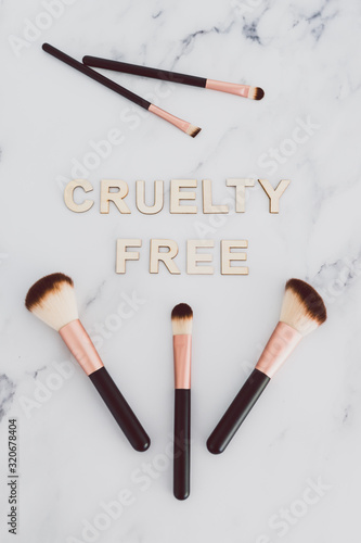 beauty industry and vegan products, make-up brushes with Cruelty free text next to them referring to the use of synthetic bristle