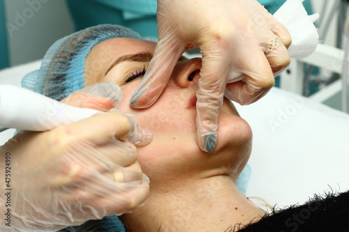 Beauty salon. A cosmetologist in medical gloves and protective mask doing a hydra peeling procedure on the client's cheeks. Side view. Close up. Professional skin care during coronavirus pandemic.