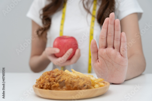 Beauty slim female body confuse French fries. Woman in restaurant achieves weight loss goal for healthy life, crazy about thinness, thin waist, nutritionist. Diet, body shape.