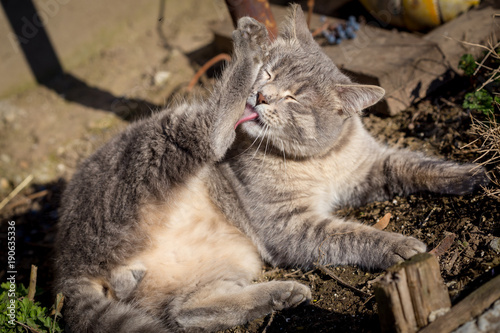 Beautyfull young gray male cat on ground
