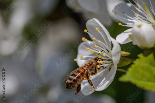 Bee on a white cherry blossom collecting pollen and gathering nectar to produce honey in the hive