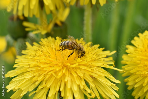 bee, flower, insect, blowball, yellow, nature, pollen, honey, macro, green, summer, spring, plant, fly, garden, flower, field, nectar, grass, animal, pollination, blossom, closeup, beauty, meadow