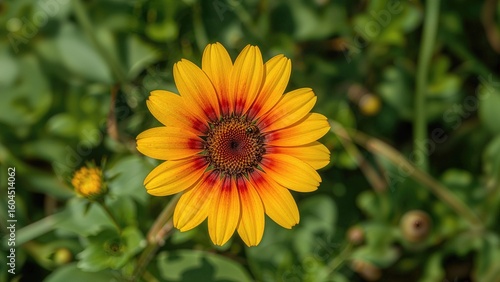 Bee perched on a vibrant yellow and red flower against a lush green backdrop