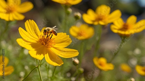 Bee Pollinating Yellow Cosmos Flower in a Lush Garden