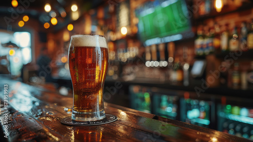 Beer Glass on Bar with Soccer Game on TV