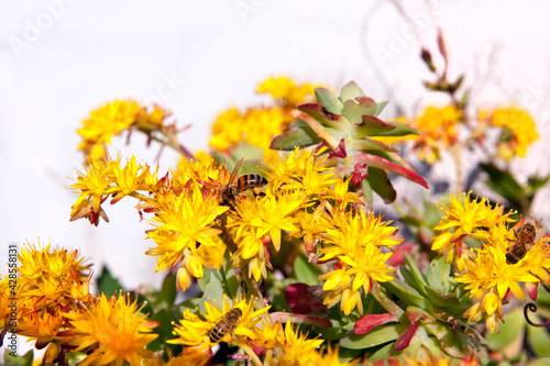 animal, insect, bee, bee, honey bee, nature, plant, flower, flowering, succulent, pollen, nectar, pollinate, pollination, pollinate, men at work, pollinator, spring, garden, countryside, closeup, flora, fauna, close, honey, work, together, blossom, blossoming, bloom, blooming, eat, feeding, botany, botanical, gardening, entomology, zoology, fly, flying, teamwork, cooperative, collaborative, collaborate, environment, environmental, yellow