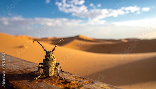 Beetle with long antennae sits on rusty metal railing in desert. Sky and sand dunes blend into horizon