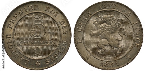 Belgium Belgian coin five centimes 1864, ruler Leopold I, denomination on grid in center circle, lion left, motto unity is strength,