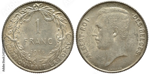 Belgium Belgian silver coin 1 one franc 1914, value and date within wreath oriented down, motto unity is strength below, head of King Albert left,