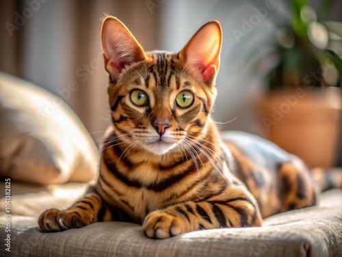 Bengal Cat Candid Photography - Adorable Bengal Cat Lies and Looks at Camera in Cozy Indoor Setting, Capturing its Unique Spots and Playful Expression in Natural Light