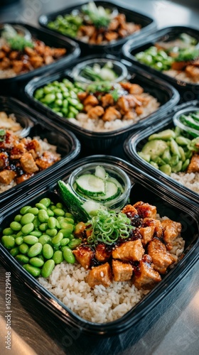 bento, teriyaki, chicken, rice, cucumber, salad, meal, lunch, take-away, box, healthy, food, protein, vegetable, glaze, sauce, green, black, tray, japanese, inspired, convenient, ready, to, eat, close, up, portion, fresh, ingredient, simple, balanced, nourishment, epicure, fast, cooked, grain, modern, cardboard box