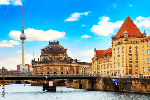 Berlin cathedral Berliner Dom and famous TV Tower with Spree river against blue sky. Berlin, Germany.