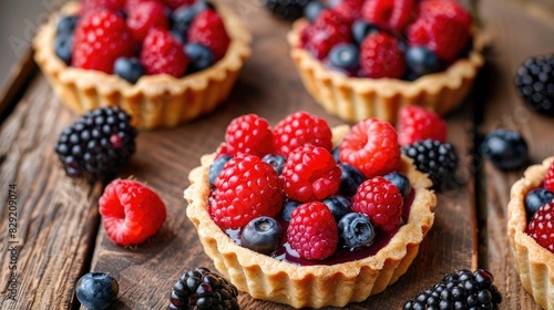 Berry filled dessert tartlets on a wooden surface