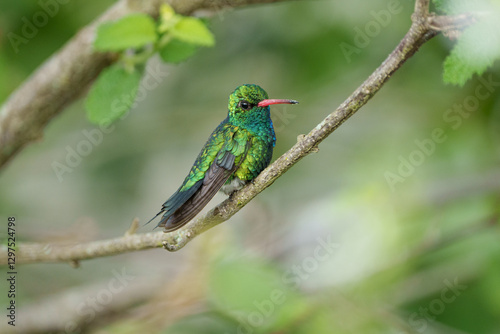 Besourinho de bico vermelho macho (Chlorostilbon lucidus) lindo beija flor colorido olhando pra frente
