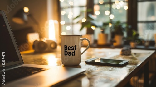 Best Dad coffee mug on office desk with a sleek laptop and smartphone. Father's Day or birthday gift