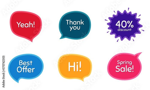 Best offer, 40% discount and spring sale. Colorful chat bubbles. Thank you phrase. Sale shopping text. Chat messages with phrases. Texting thought bubbles. Vector
