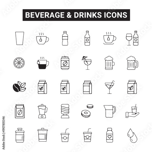 Beverage drink icon set, drinks menu outline icons, cold hot beverage symbols, drink vector pack, cafe beverage line icons, bar drink icons, food drink ui pack