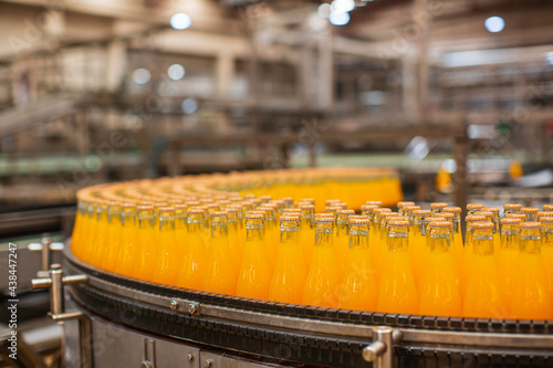 Beverage factory interior. Conveyor flowing with bottles for juice