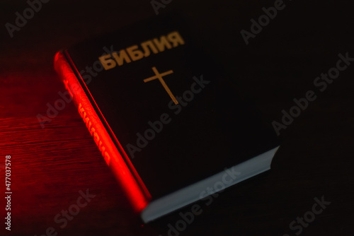 Bible book on the table, on a dark background. Translation of the text in Russian: the Bible.