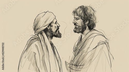 Biblical Illustration: Nicodemus Visits Jesus, Nighttime Discussion, Teaching on Being Born Again, Beige Background, Copyspace