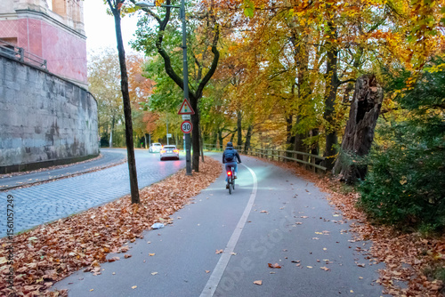 urban, munich, biking, street, road, german, city, bicycle, autumn, blue, transport, asphalt, town, bicyclist, traffic, track, white, leaf, bike, cycle, city landscape, bicycle lane, sport, background, route, orange, way, leaf