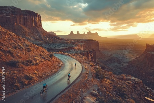 Bicyclists riding on a winding canyon road at sunset in a stunning desert landscape, Cinematic drone shot of bicyclists on canyon road at dawn