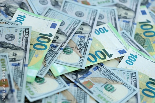 Big pile of Euro and USD banknotes. Many european and united states dollars