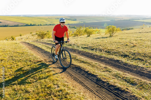 Bike adventure travel photo. Bike tourist rides on the country road. Sunset on background.