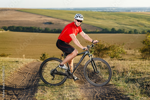 Bike adventure travel photo. Bike tourist rides on the country road. Sunset on background.
