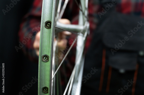 Bike repair. Bicycle rim close-up. Studio photo. black background.