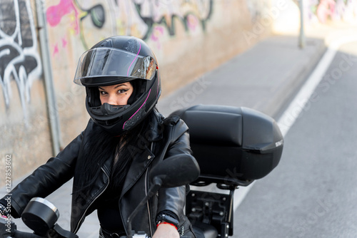 woman, biker, motorcycle, helmet, riding, scooter, urban, city, street, leather jacket, fashion, style, transportation, travel, adventure, freedom, rebellious, cool, trendy, graffiti, wall, background, road, vehicle, motor, engine, power, speed, lifestyle, girl, female, portrait, face, expression, confidence, independent, strong, modern, contemporary, hobby, leisure, activity, weekend, fun