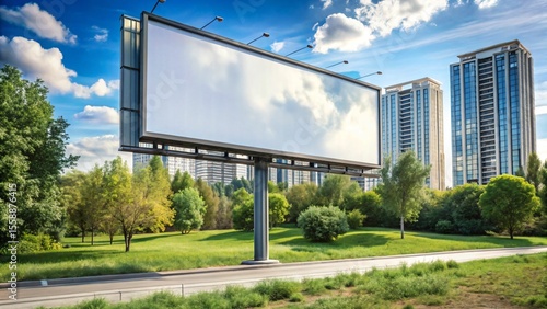 billboard, advertisement, city landscape, city landscape, skyscraper, greenery, tree, grass, blue skies, cloud, advertising space, roadside, marketing, serene, calm, peaceful, daytime, daylight, urban scene, lawn