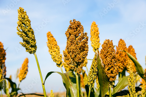 Biofuel and new boom Food, Sorghum Plantation industry. Field of Sweet Sorghum stalk and seeds. Millet field. Agriculture field of sorghum, named also Durra, Milo, or Jowari. Healthy nutrients