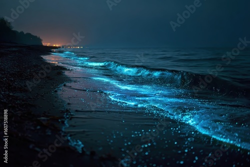 bioluminescence, wave, ocean, sea, beach, night, dark, water, shore, coast, coastal, marin, nature, natural, light, glowing, blue, sparkle, sparkling, algae, plankton, microorganism, phenomena, science, environment, ecological, ecosystem, tide, tidal, sand, landscape, seascape, travel, tour tourism, vacation, holiday, scenic, beauty, beautiful, peaceful, serene, tranquil, relaxation, mystery, magical, aethereal, dreamlike, fantasy, surreal