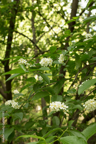 Bird Cherry Tree in Blossom. Close-up of a Flowering Prunus Avium Tree with White Little Blossoms. View of a blooming Sweet Bird-Cherry Tree in Spring.