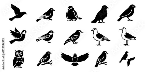 Bird icons set: 15 black-and-white silhouettes with owl, hawk, flying, perched, standing birds, minimal vector style.
