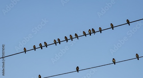 Birds perched on power lines against clear blue sky nature wildlife concept