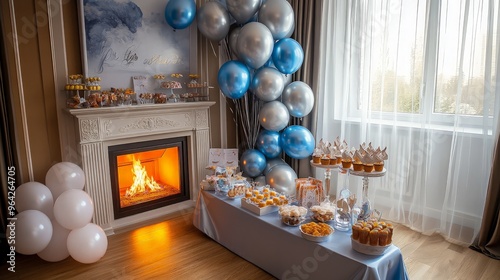 party, birthday, celebration, balloon, decoration, candle, cake, dessert, food, table, buffet, sweet, treat, candy, gift, present, fireplace, fire, room, interior, design, home, decoration, festive, joy, happy, gathering, family, friends, love, fun, event, occasion, special, elegant, stylish, modern, luxury, white, blue, silver, gold, yellow, brown, wood, window, curtain, light, bright