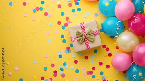 Birthday party flat lay with colorful balloons and confetti escaping from a gift box