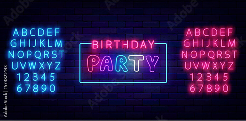 Birthday party neon label. Rectangular frame. Light event. Luminous blue and pink alphabet. Vector stock illustration