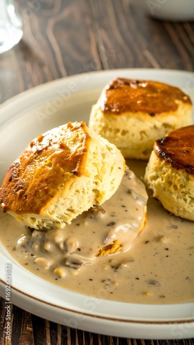 biscuit, gravy, food, breakfast, plate, white, wooden, table, delicious, morning, meal, hot, savoury, creamy, saucy, dinner, served, appetising, closeup, deliciously, comfort, american, homemade, eatery