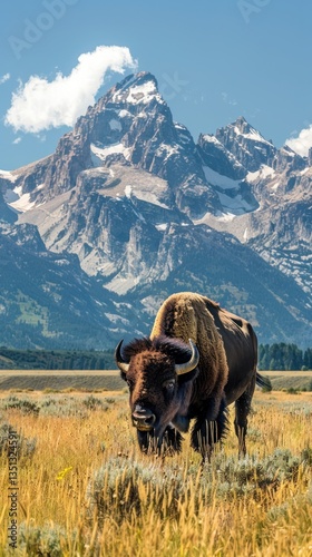 Bison grazing in Grand Teton National Park, majestic mountains in the background