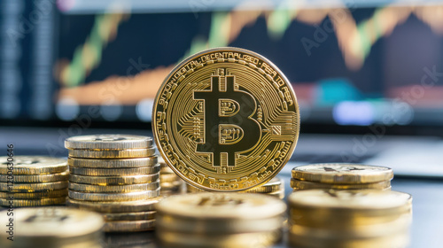 Bitcoin coin on stack of coins with trading charts in background, symbolizing cryptocurrency investment and market trends