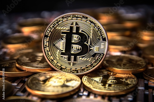 Bitcoin coin on the background of gold coins. Cryptocurrency concept, Bitcoin Cryptocurrency with price chart, AI Generated