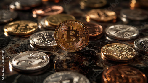 Bitcoin coin surrounded by various other cryptocurrency coins on a reflective surface