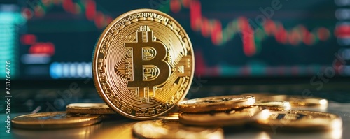 Bitcoin coins and trade chart on blur background. Cryptocurrency concept.