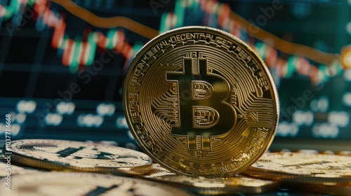 Bitcoin Cryptocurrency Coin with Stock Market Chart Background
