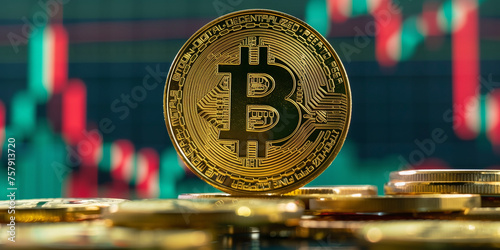 Bitcoin in focus with a stock market graph in the background, reflecting financial trade